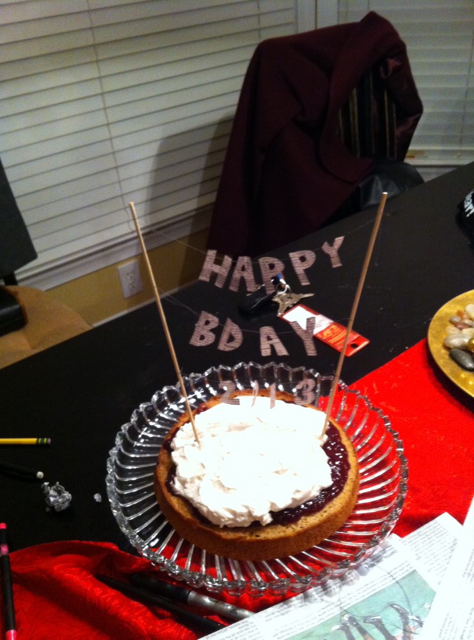 I decided that since it was NYE, we needed to sing happy birthday to 2013, so we did. And we also decided that it was completely necessary to SEW a newspaper greeting with sewing thread and two kebab sticks. One of our guy friends walked in during a climactic sewing moment, and I think he probably considered leaving what may have looked like a knitting party. (Srsly though, it was more exciting once more people got there). Here’s some pics of our cake!
