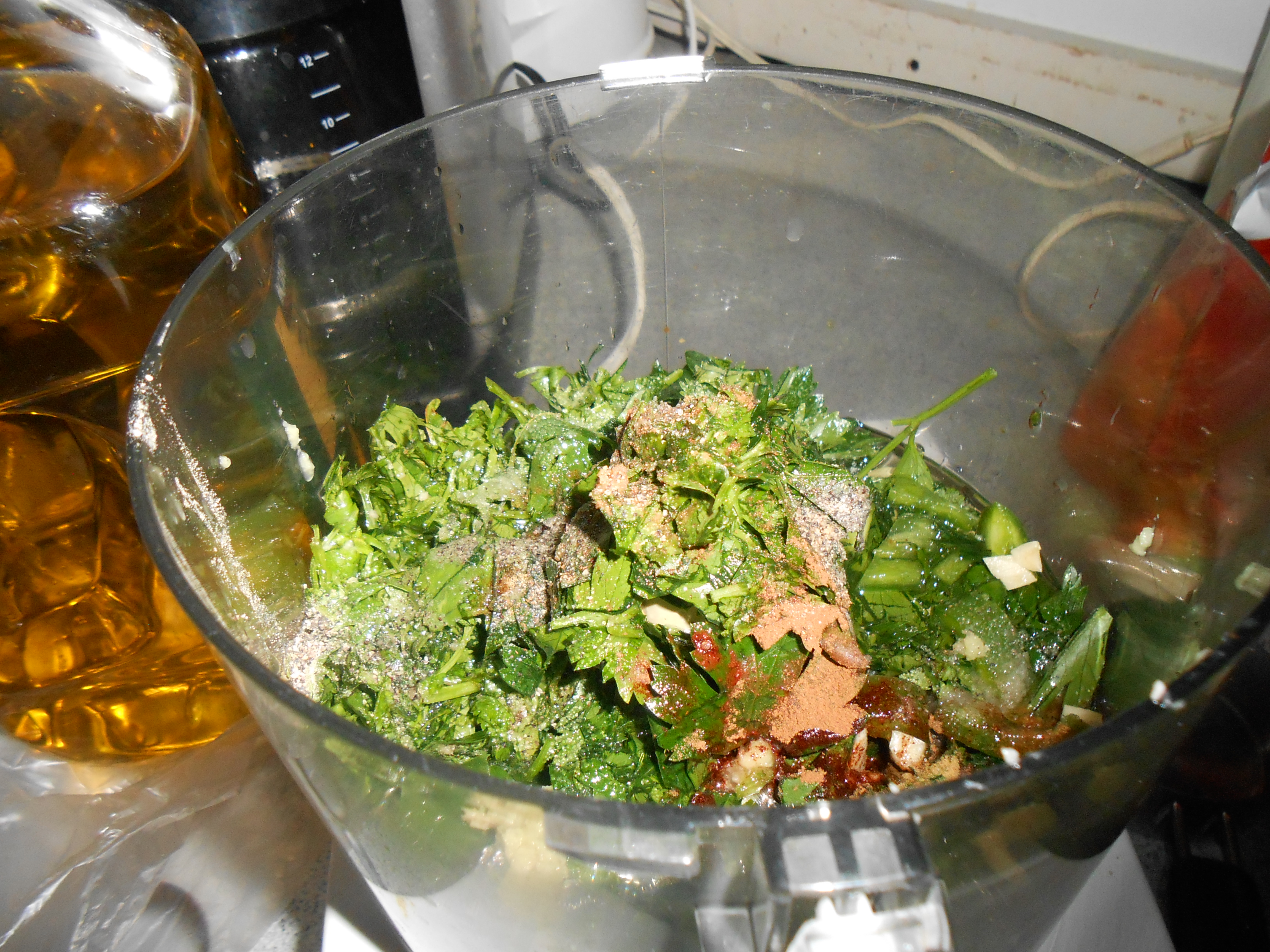 My dad makes a really good Spanish rice with those canned diced tomatoes with jalapenos or chiles, tomato paste, onions, garlic, and chicken broth I think. Then for a quick improvised veggie dish, I sauteed some cauliflower, kale, red beans, and corn with a spice mixture of paprika, cumin, chili powder, garlic powder, S&P. To thicken it up, I also added some tomato paste and chicken broth. Make this marinade this summer for any grilled food or as a pretty topping 🙂