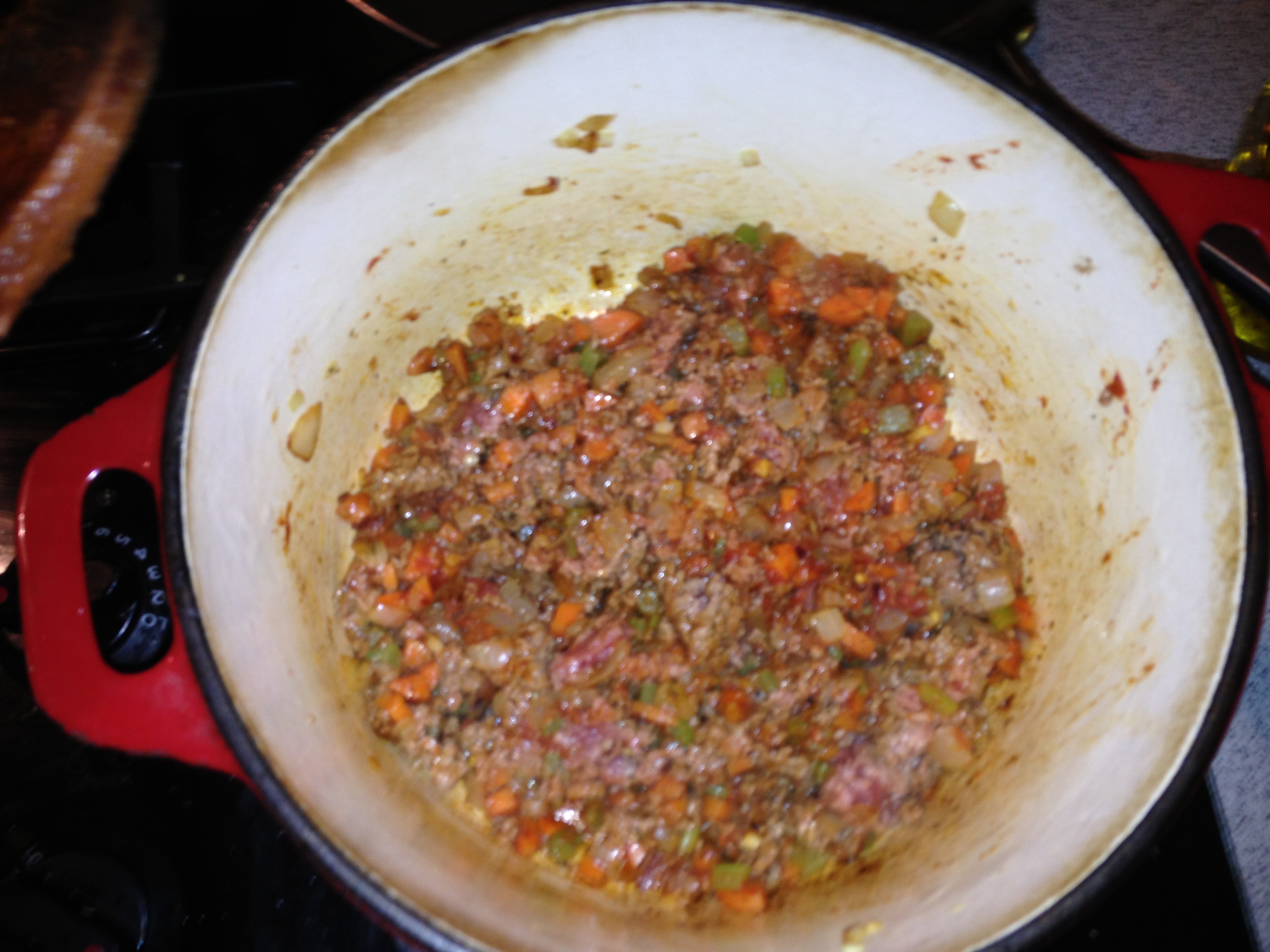 Please make this lamb bolognese for your guests. Adrianna says this feeds four, and I must say this feeds four people of moderate hunger. I would double the recipe if you were having hungrier friends around. I’m working on prep these days so I’m not making such a mess in the kitchen, and I think it’s working out well. The first thing is, chop up your carrots and onions first. Most of the bolognese recipes I have made before include celery, so I added a stalk and a half of celery and the mire poix was solid. Plus it just looks pretty right? I had no shallots on hand so used 1/2 of a very large onion.