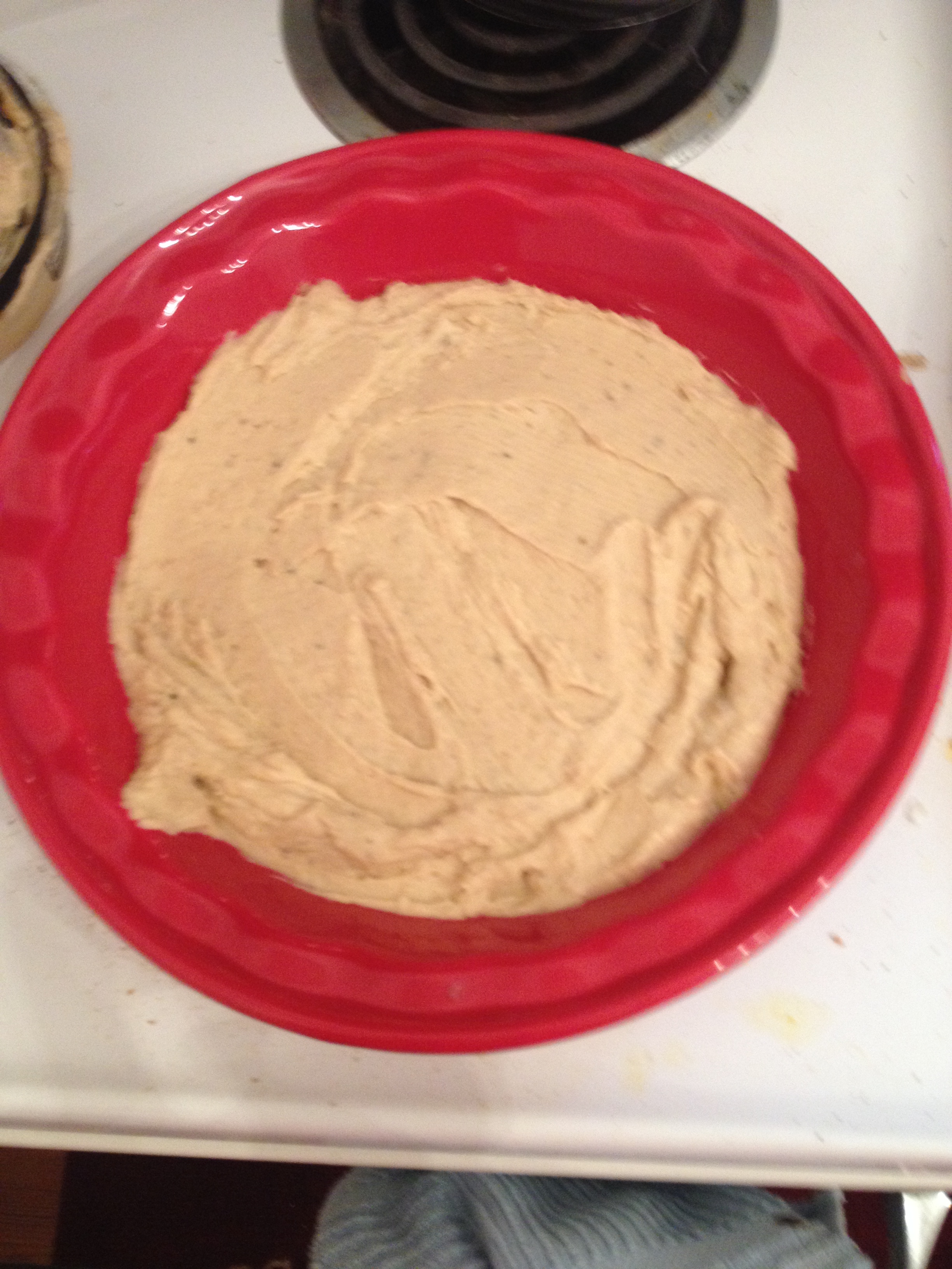 2. Assemble! I used two different kinds of hummus so I spread them both together in the bottom of a pie plate. After the hummus, add your cilantro pesto in the middle and spread out in an even layer. Then add your toppings! Cukes, red onion, pepps, olives, tomatoes, and you can either end with the feta or add it in batches.