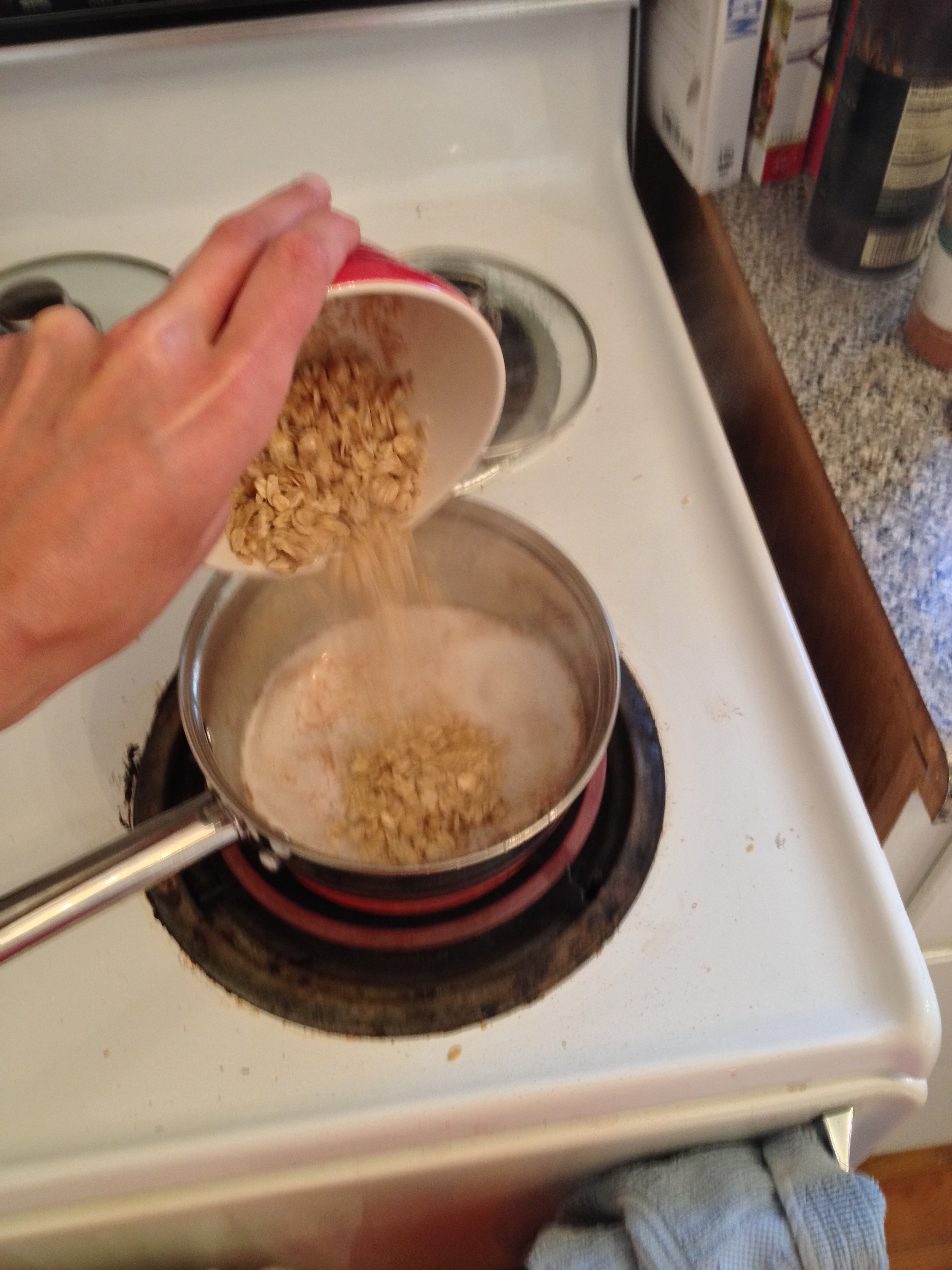 1. Prepare oatmeal: Melt the butter in a skillet or small saucepan, add oats and toast until it sort of smells like browned butter…aka a bit of a nutty flavor. The recipe says about 4 minutes, took more like 5-6 for me. After toasted, pour out the oats. Sprinkle a pinch of salt, a LARGE dash of cinnamon and a small pinch of nutmeg if you’d like. Add liquid and bring to a simmer. Add in oats and stir quickly to make the mixture evenly mixed. Remove from the heat and set aside for about 8 minutes to let the oats absorb.