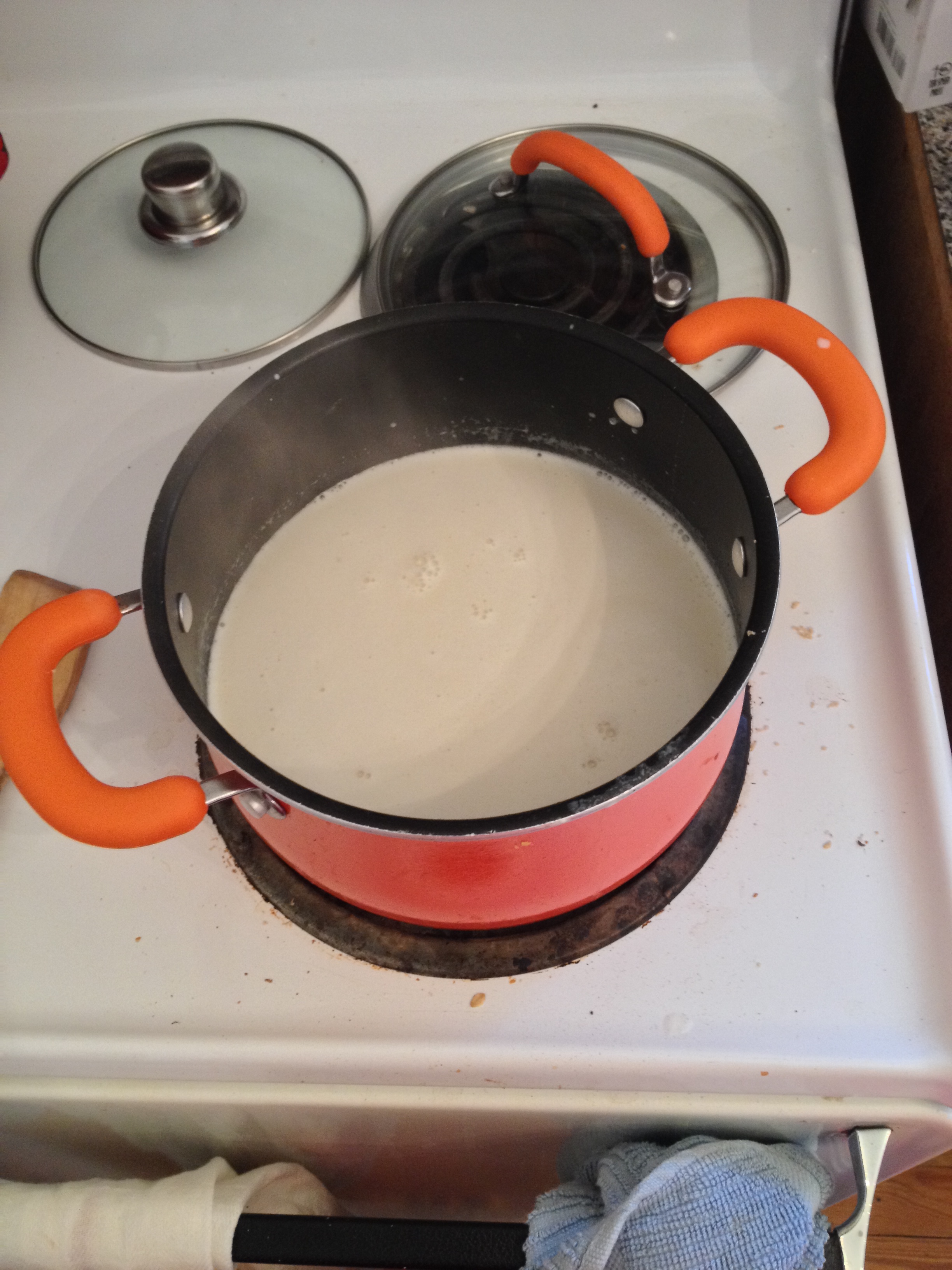 3. Once the cream mixture is simmering (really a pleasant thing, right? hot milk?), slowly temper your eggs. Do this by ladling about a half cup of the hot mixture slowly into the eggs, whisking quickly to mix the two. Once you’ve quickly whisked together the hot milk into the eggs, add the egg milk mixture into the pot and whisk constantly to temper. The recipe said to just whisk until it thickens, but I couldn’t really tell it was thickened, so I’m going to tell you to whisk for about 6 minutes at a low simmer. Then remove from heat.