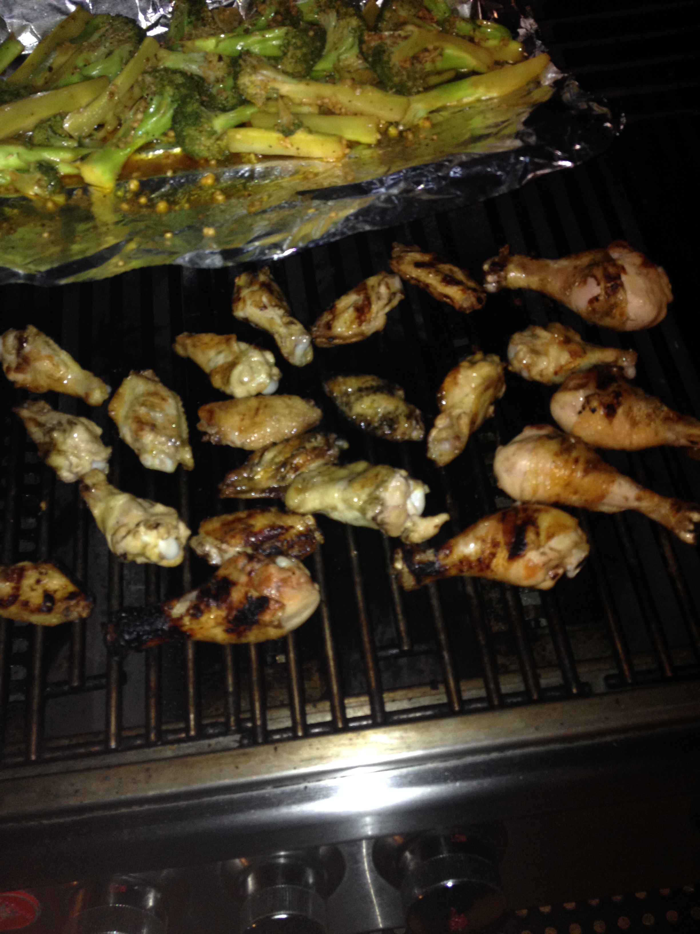 Prepped the grill – make sure to take your time to let it heat up medium/medium high heat. Mike had already prepped the sauce so we just put it on low on a burner to keep the sauce warm. If you hadn’t prepped in advance, make sauce. Add the chicken wings onto the grill, rotating every 2 minutes or so to evenly cook them. After about 20-25 minutes, wings were about done and we tossed them in the sauce and voila! a carnivorous meal. 2014-10-09 20.11.48
