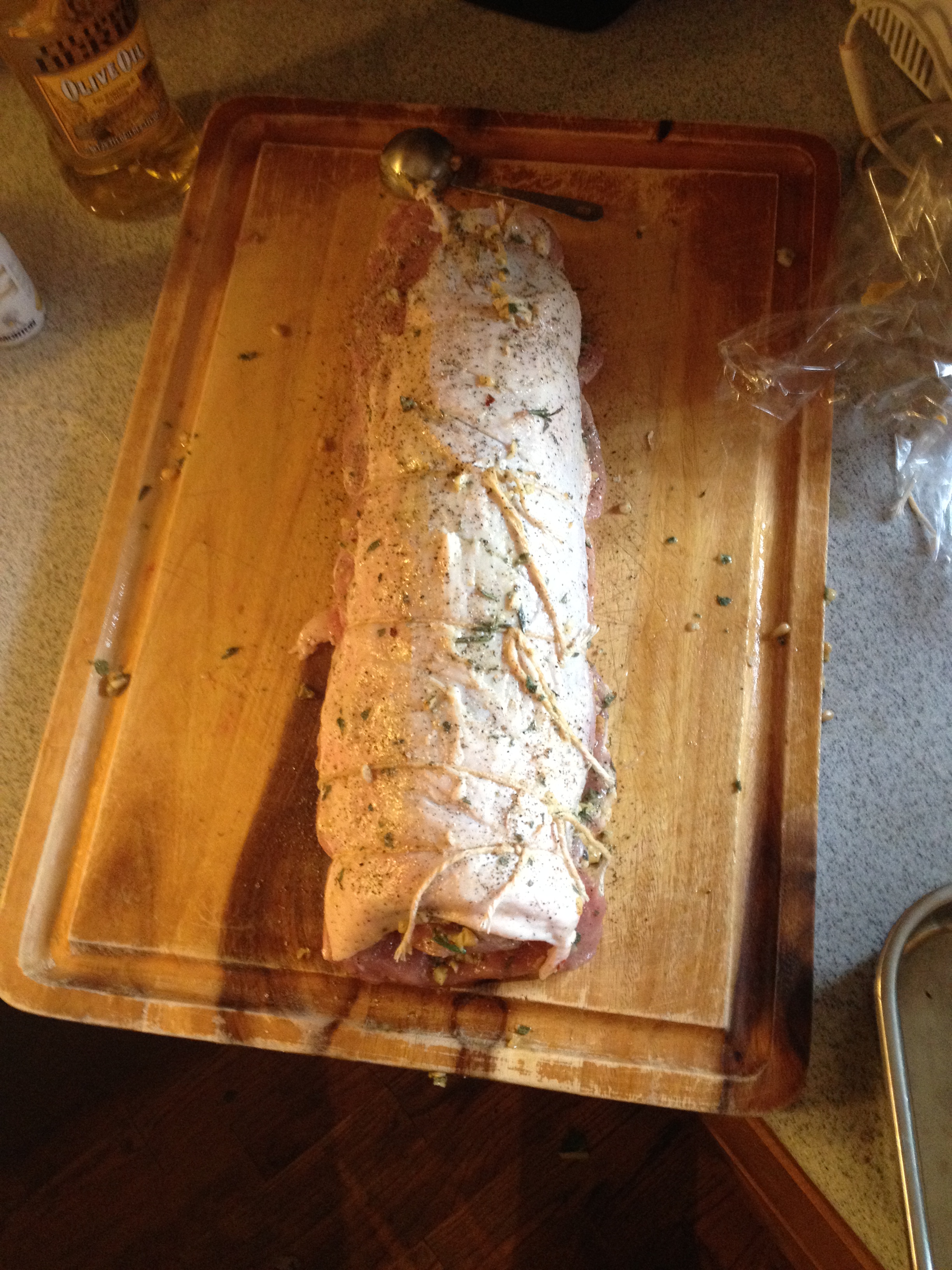 5. If you have somebody around, this is the part where it’s helpful to have help!! The same way that you cut the pork is the way to roll it up. Starting from left to right, roll the pork into a log, making sure your stuffing stays inside. Once you’ve rolled the log tightly, use twine or thread to tie the roll together. I used about 5 pieces of twine and knotted at the top after rolling the log up.