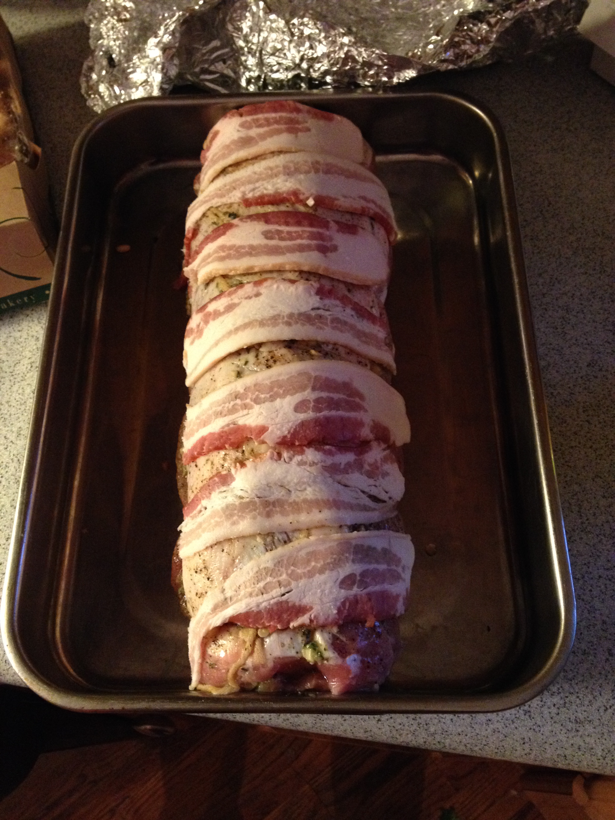 7. One to two hours before cooking the pork, take it out of the refrigerator to let the meat come to room temperature. Get your bacon out and drape over the top of the pork (this was a game time decision for me and such a good call). I cut the pieces of bacon in half.