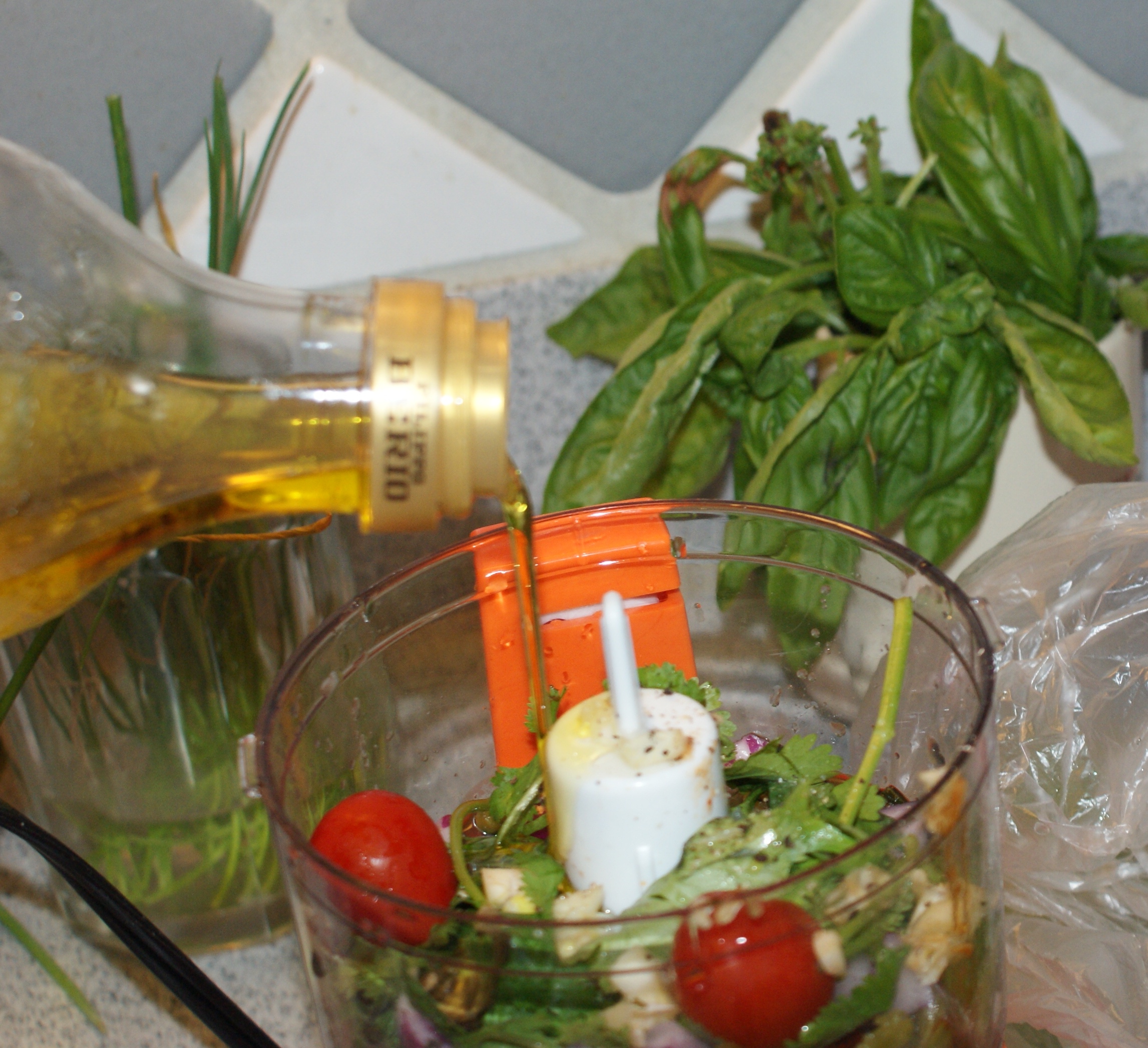 1. Make the cilantro pesto: Add the garlic, cilantro, walnuts, some fresh cracked pepper, and 2 TBS olive oil to the bowl of a small food processor. Pulse until not quite a paste, but everything is mixed evenly. Then, slowly drizzle in your olive oil. I didn’t end up needing the whole 1/3 of a cup, but I do like my pesto thicker. After you’ve finished pulsing, mix in your feta (don’t pulse in the food processor, just slowly mix into the mixture)