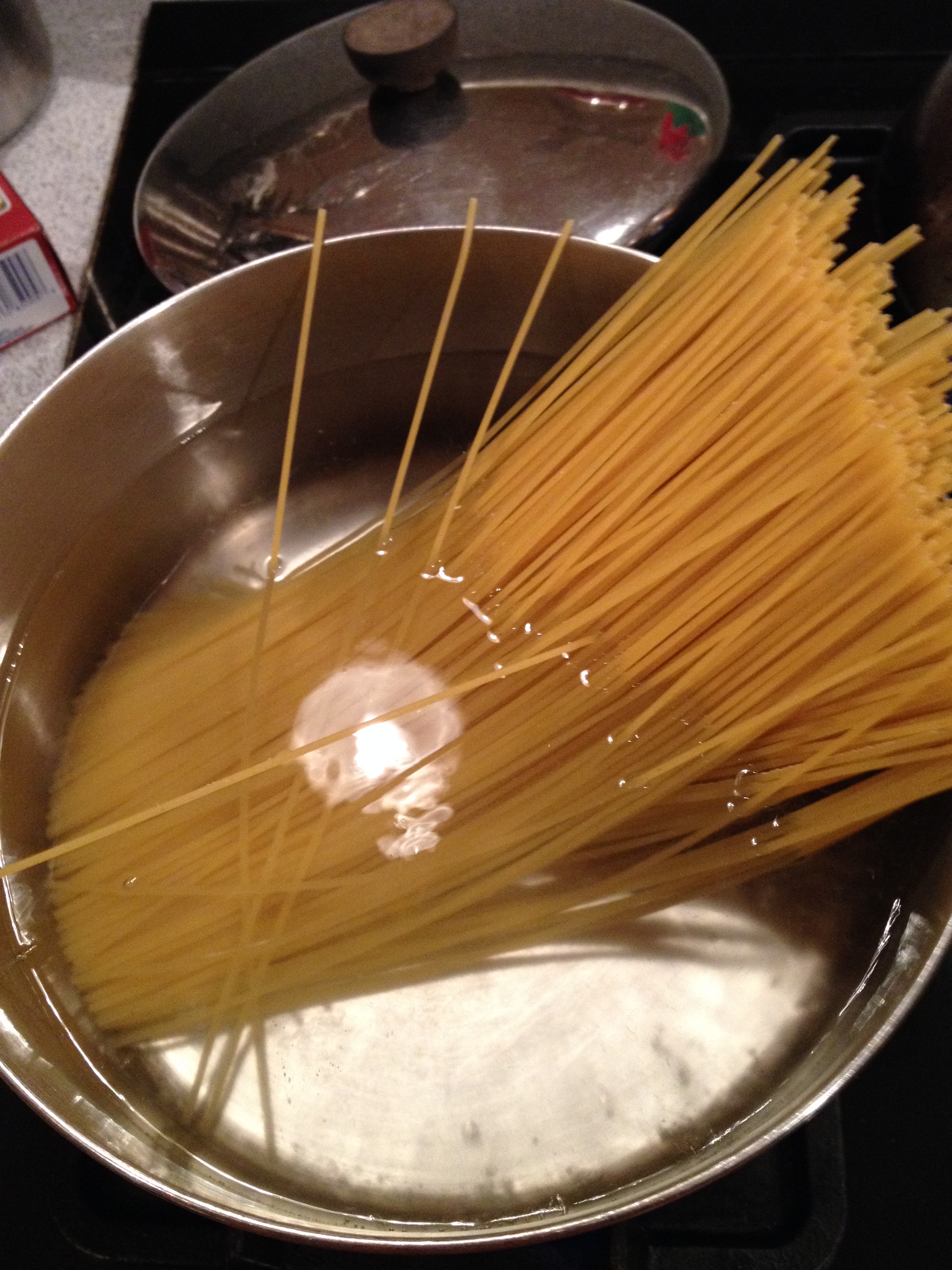 1 lb long pasta (linguini is our favorite, I had spaghetti on hand here)