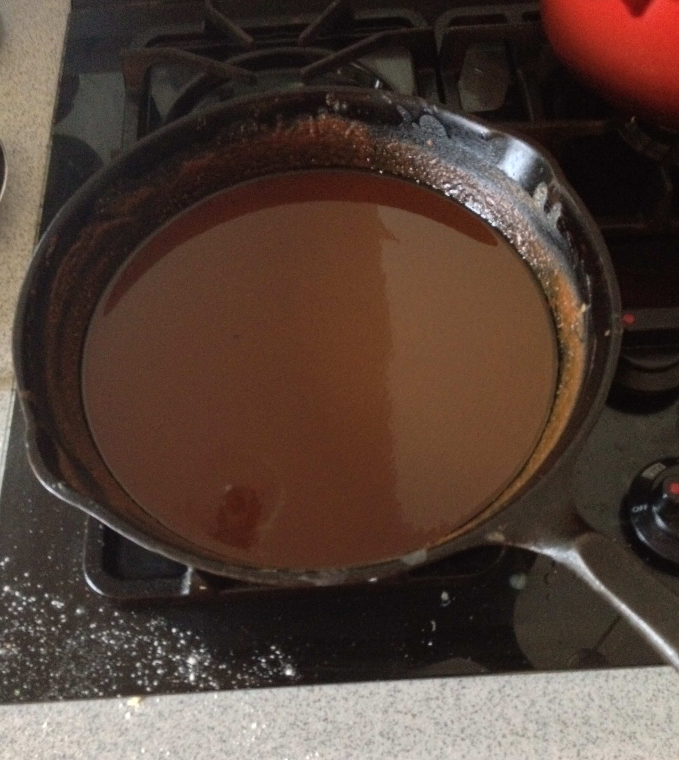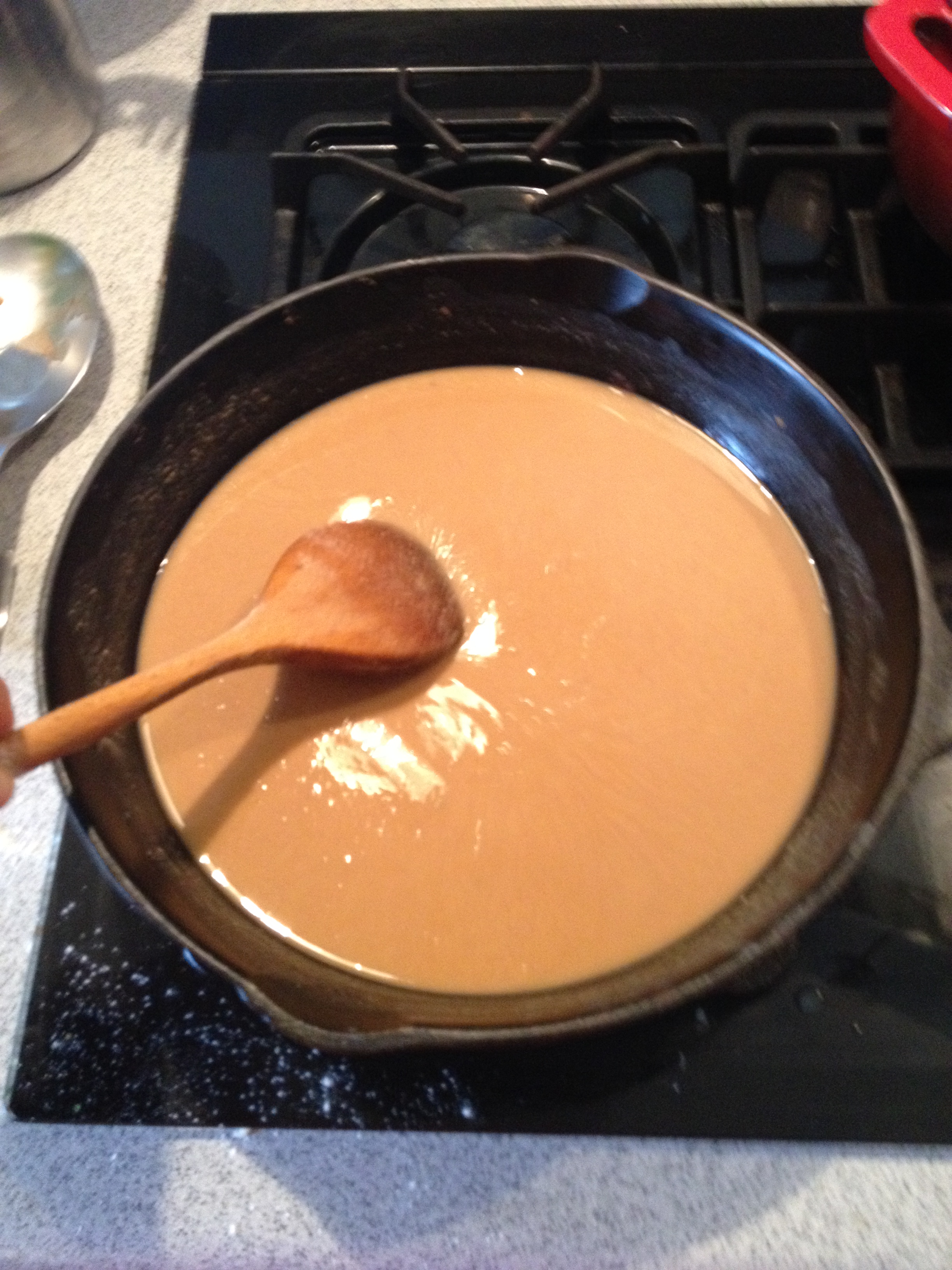 2. In a cast iron skillet, Dutch oven or wide pan with a thick bottom, heat your oil for 2 minutes. Gradually stir in the flour at a medium heat with a wooden spoon. Like I said, watch carefully and continue to stir until the roux turns a deep coffee ish color but redder (see picture). This takes about 20 minutes.