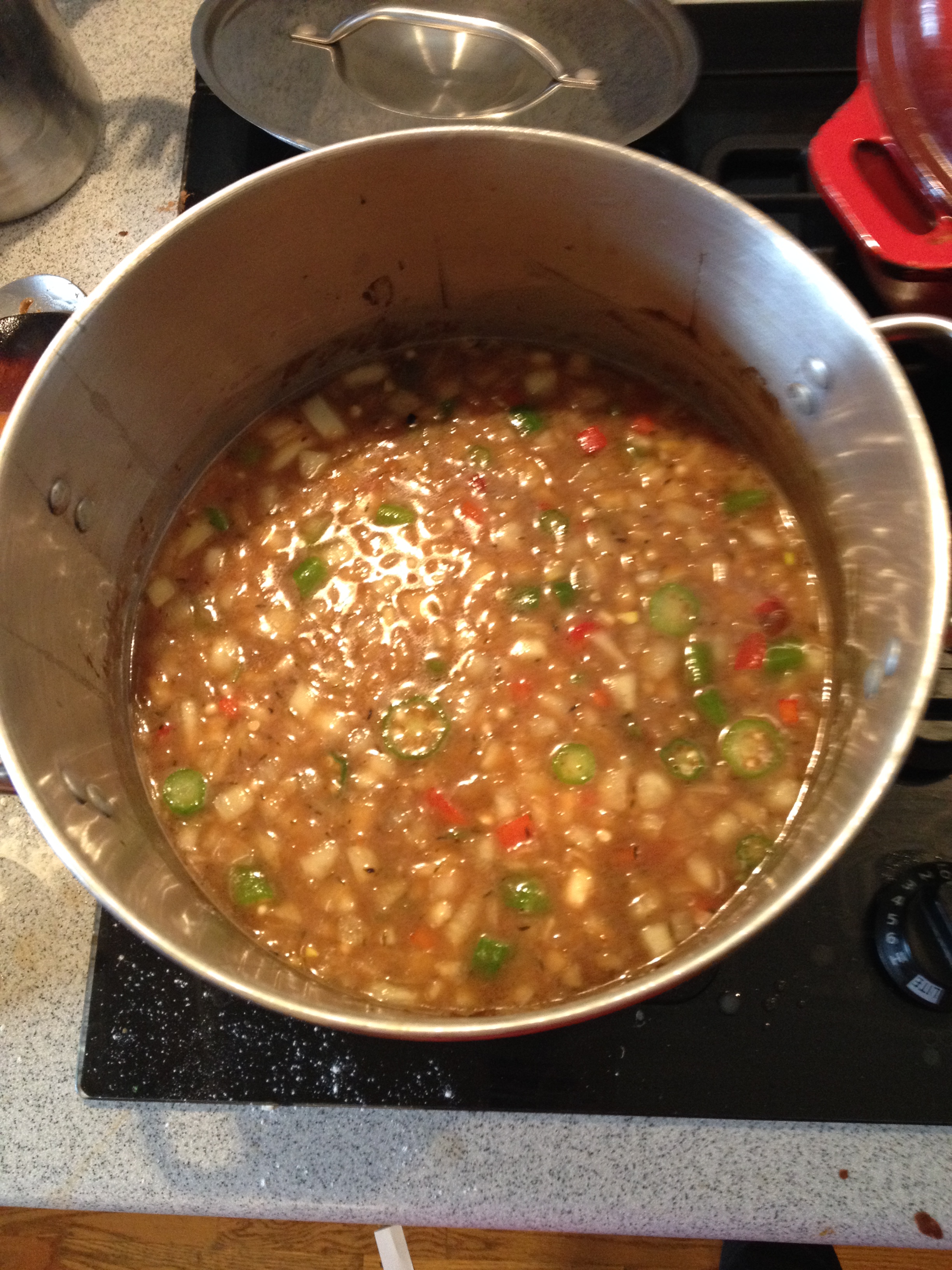 And then, you cook a whole bunch of yummy veggies, stock, shrimp, and sausage and everything comes together QUITE smoothly.